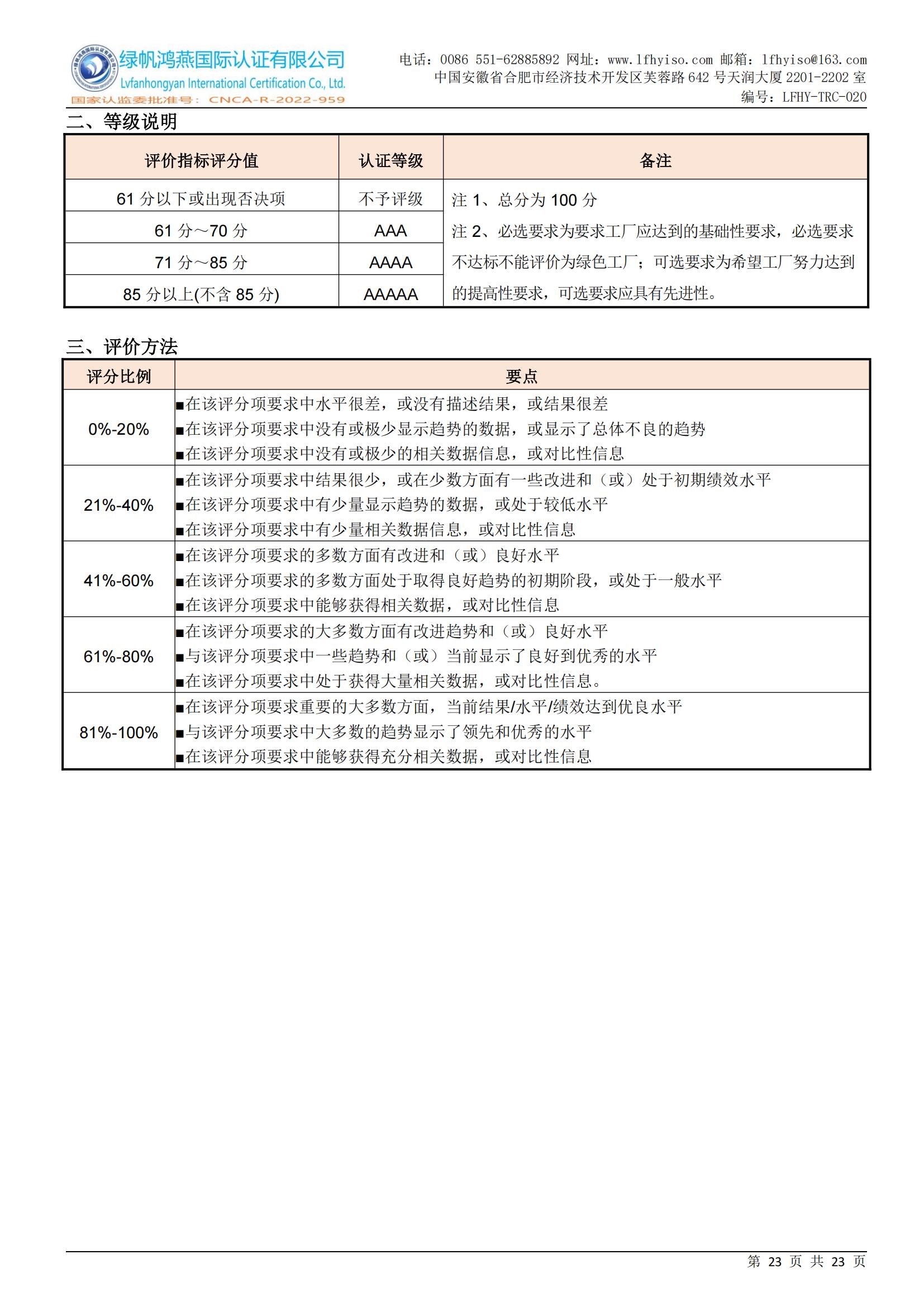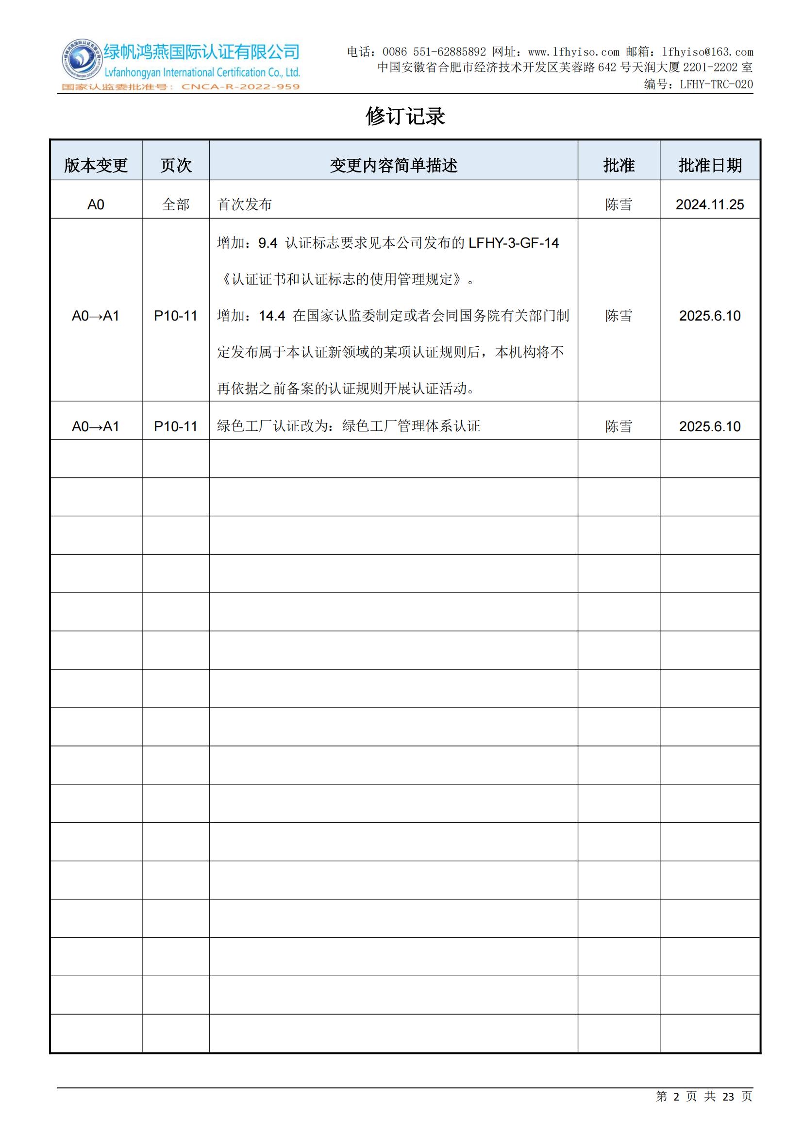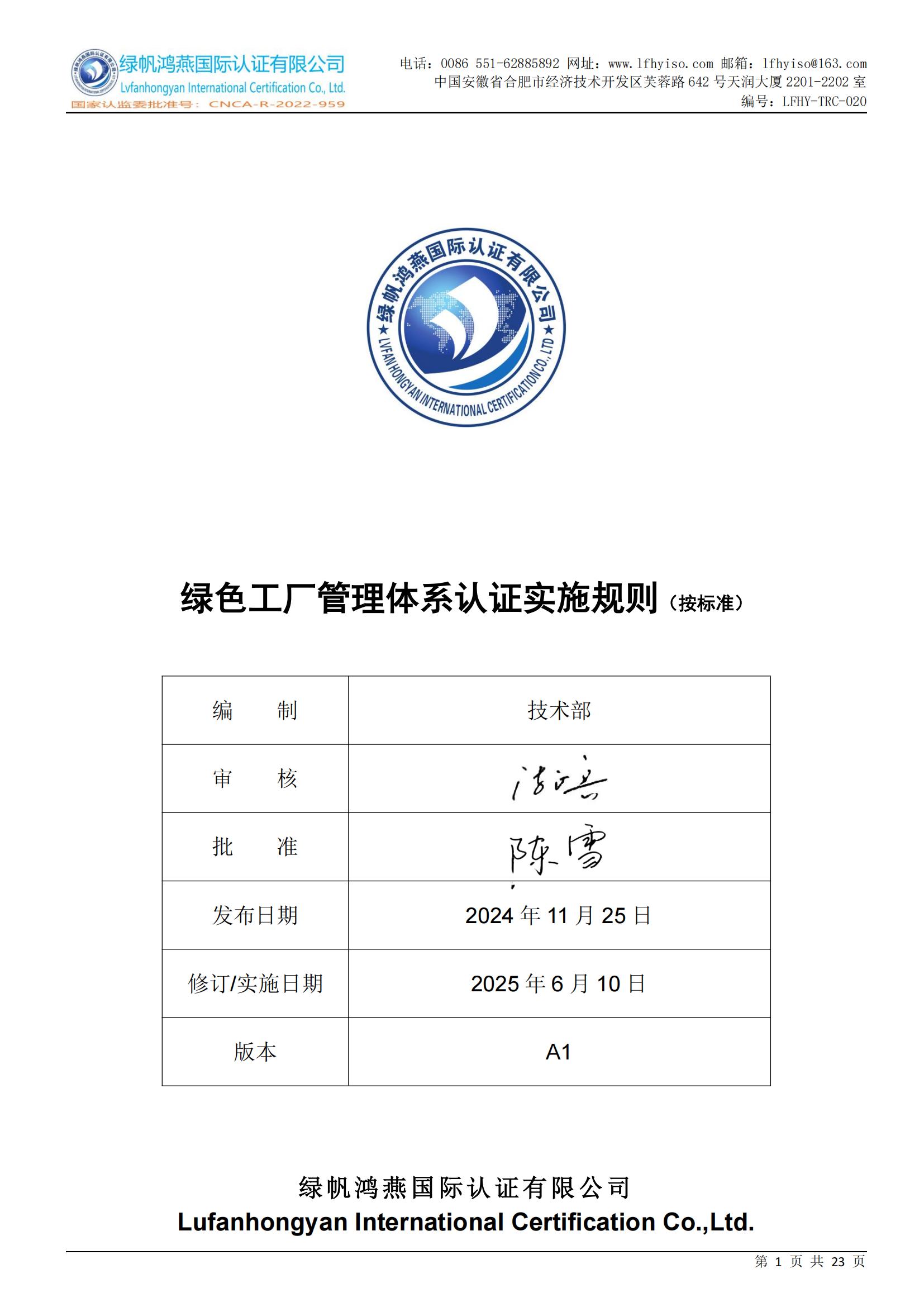 20-1==綠色工廠管理體系認(rèn)證規(guī)則備案附件【按GBT 36132-2018標(biāo)準(zhǔn)】【分級】【20250610修訂】LFHY-TRC-020《綠色工廠管理體系認(rèn)證實(shí)施規(guī)則》【20250610A1版】